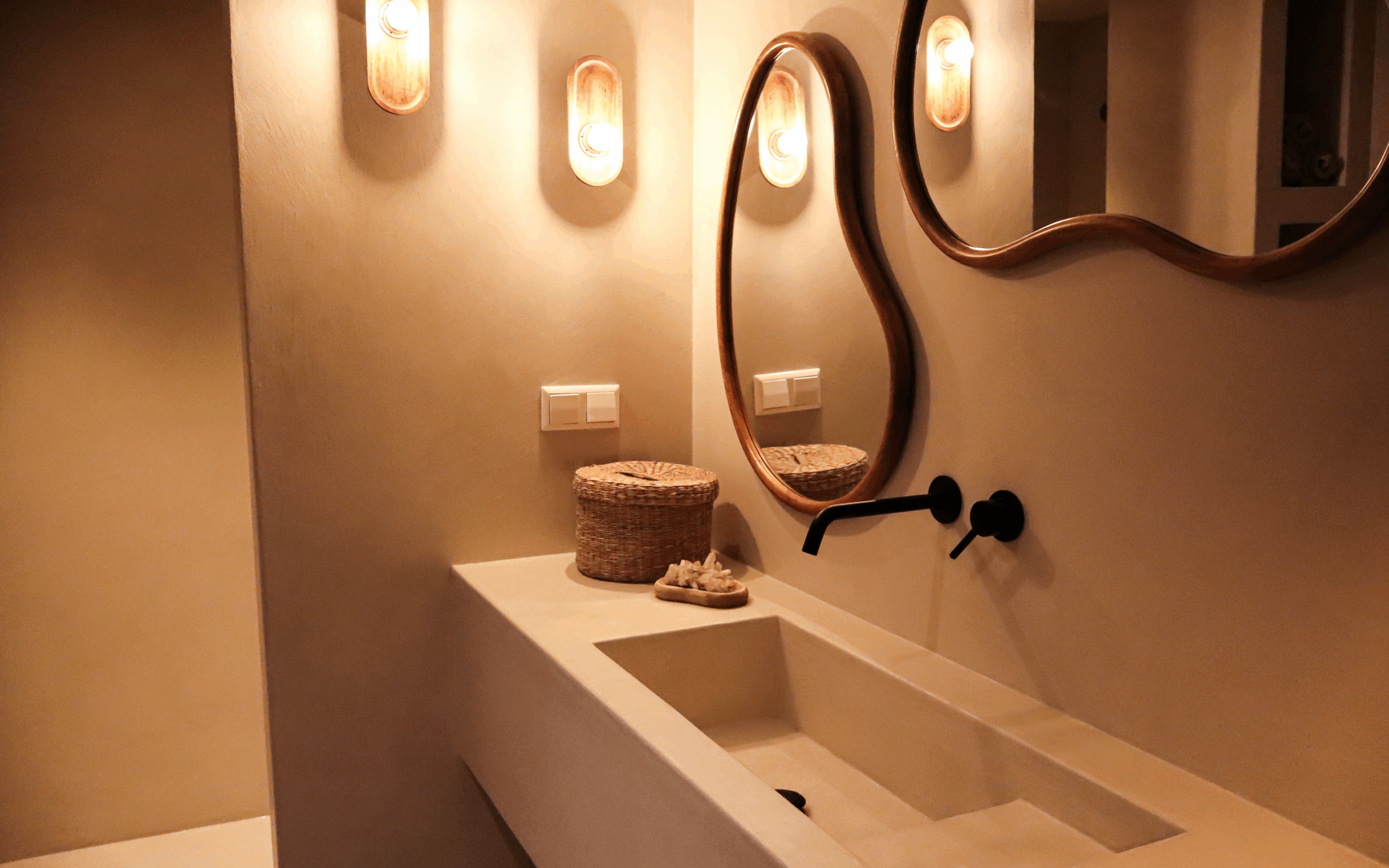 Een ruimte volledig bekleed met microcement ademt een serene, tijdloze rust. De naadloze afwerking zorgt voor een visuele eenheid die het interieur ruimtelijker maakt; wanden en vloeren vloeien moeiteloos in elkaar over. Door het fluweelmatte oppervlak ontstaat een zachte, natuurlijke gloed die licht op een subtiele manier weerkaatst.