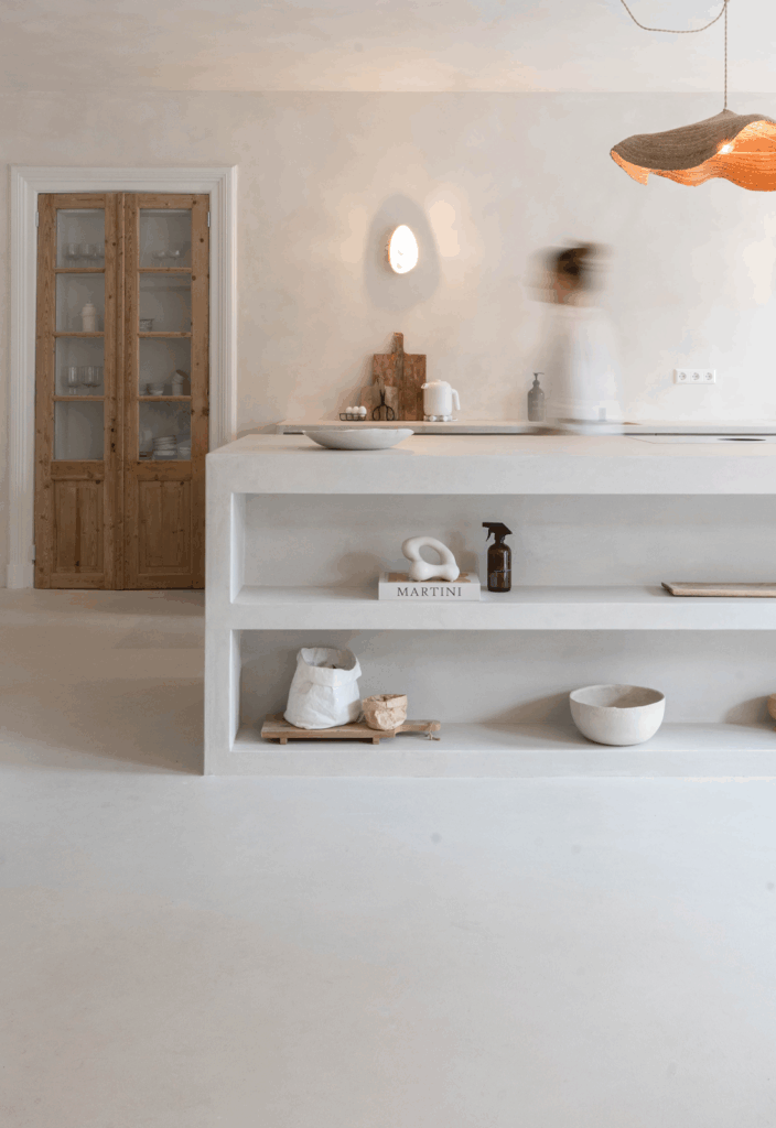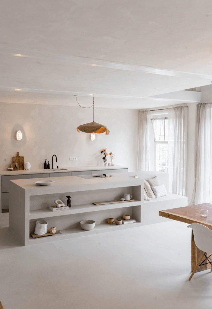 In deze woning in Utrecht hebben we een keuken gerealiseerd die volledig is afgewerkt in microcement. Het resultaat is een rustige, moderne ruimte waarin keuken en vloer één strak geheel vormen. De microcementvloer loopt naadloos door in het keukenontwerp, waardoor de ruimte optisch groter, lichter en harmonischer aanvoelt. De egale, waterdichte afwerking zorgt daarbij voor een tijdloze uitstraling en praktisch gebruiksgemak in het dagelijks leven.