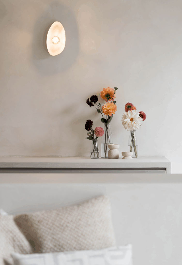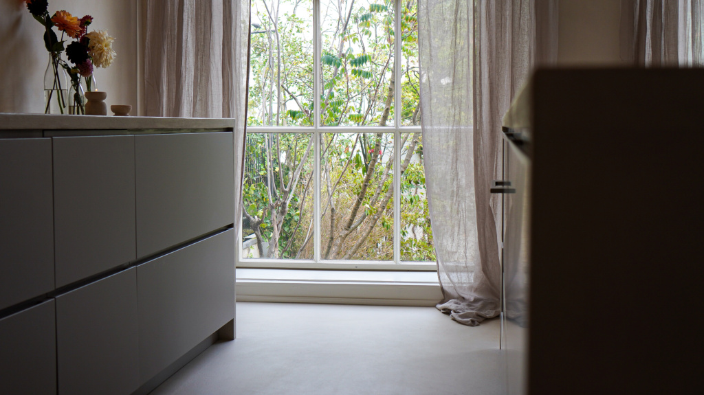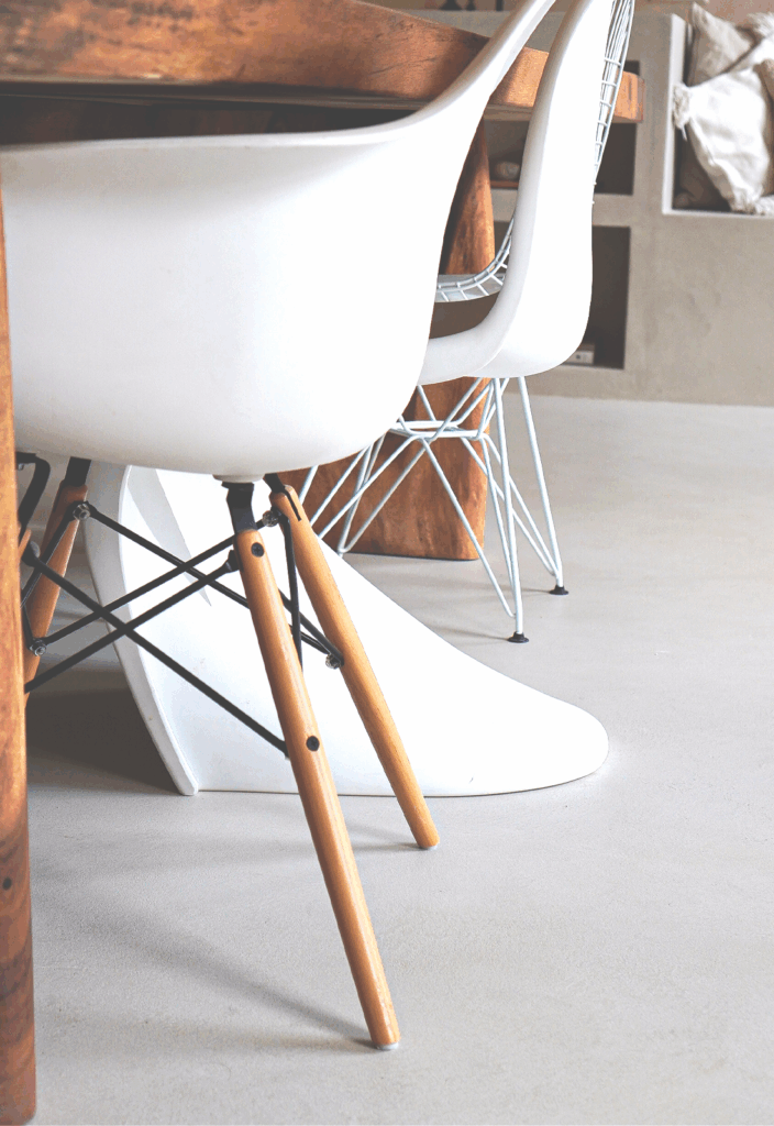 Ongeveer 56 m2 aan Concrete microcement op de vloer zorgt voor een strakke en naadloze afwerking. Microcement bleek hier de perfecte keuze: waterdicht, slijtvast en volledig naadloos. Geen voegen, geen onderbrekingen, alleen een strak en egaal oppervlak dat de natuurlijke lichtinval nog sterker tot zijn recht laat komen. De vloer sluit harmonieus aan op de keuken, waardoor een serene en tijdloze uitstraling ontstaat die past bij de stijl van het huis én bij het dagelijkse gebruik.