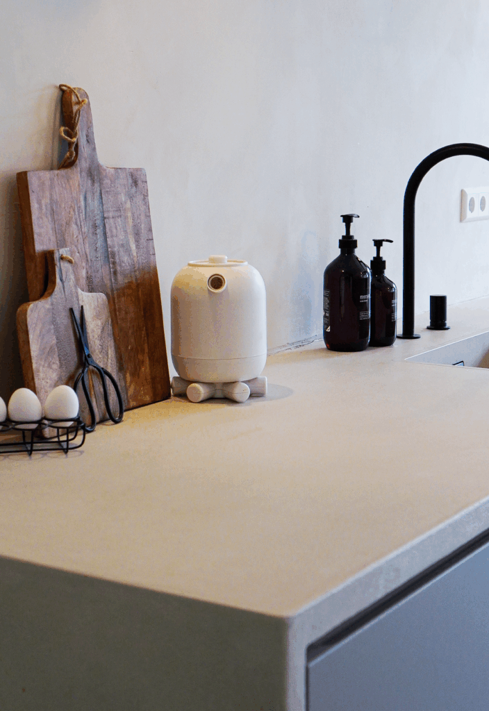 De keuken is volledig afgewerkt met microcement, waardoor een strak en tijdloos geheel ontstaat. De naadloze structuur geeft de keuken een rustige uitstraling en maakt het materiaal bijzonder praktisch in gebruik: waterdicht, slijtvast en eenvoudig schoon te houden. De subtiele textuur brengt warmte in het ontwerp, terwijl het moderne karakter perfect aansluit bij de lichte ruimte.